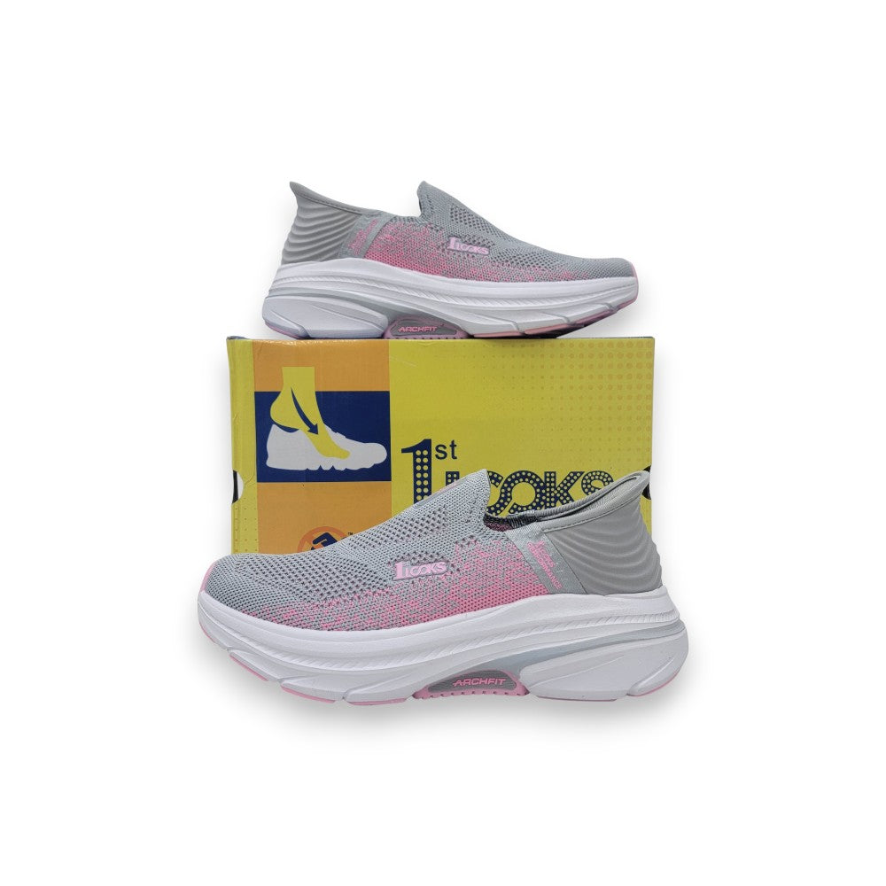 Step into all-day comfort and effortless style with the 1st Look ArchFit Slip-On – Grey/Pink. Designed with a breathable engineered knit upper, this slip-on combines a sporty vibe with a feminine touch thanks to its subtle grey and pink gradient design.