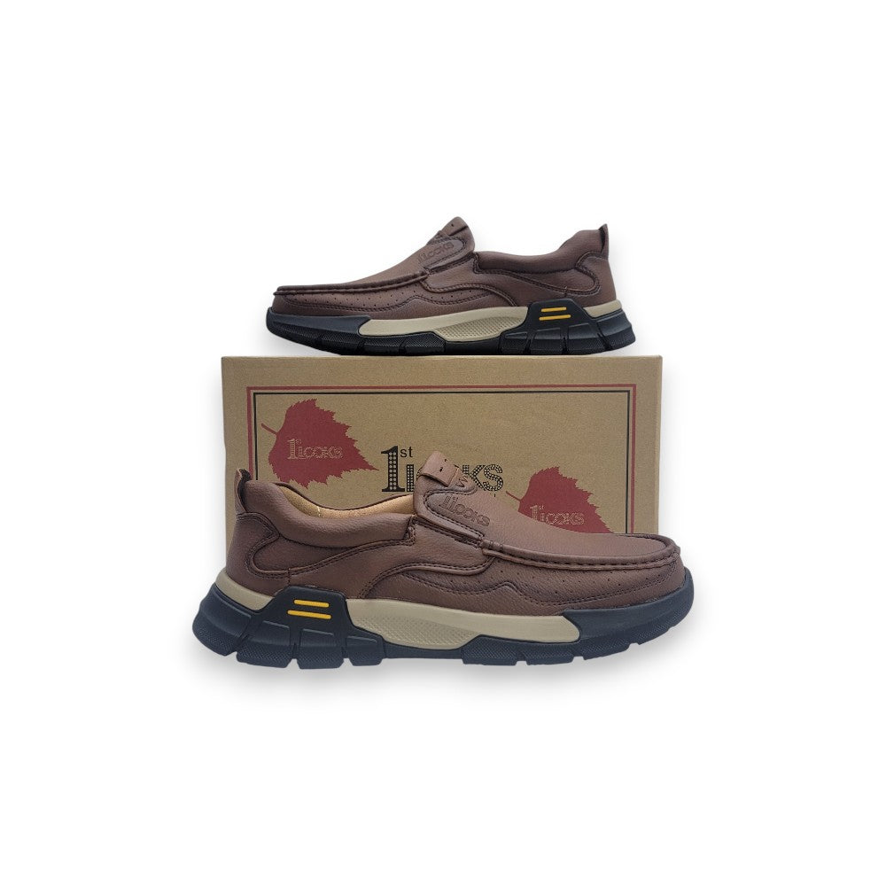 Bring a rugged yet refined touch to your everyday style with the 1st Look Urban Slip-On – Brown/Black. Featuring a smooth brown upper and a chunky black outsole accented with beige and yellow details, this shoe strikes the perfect balance between casual comfort and bold street style.