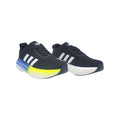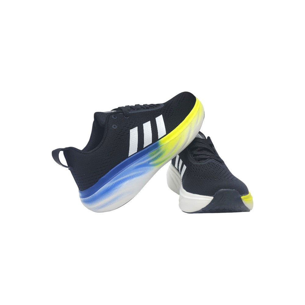 Step into comfort and style with the Adidas Aero Glow Runner. Designed for runners and everyday athletes, this shoe combines a sleek black upper with the signature three white stripes for a classic Adidas look. The vibrant midsole features a striking glow effect with shades of blue and yellow, adding a bold pop of color that makes every step stand out.