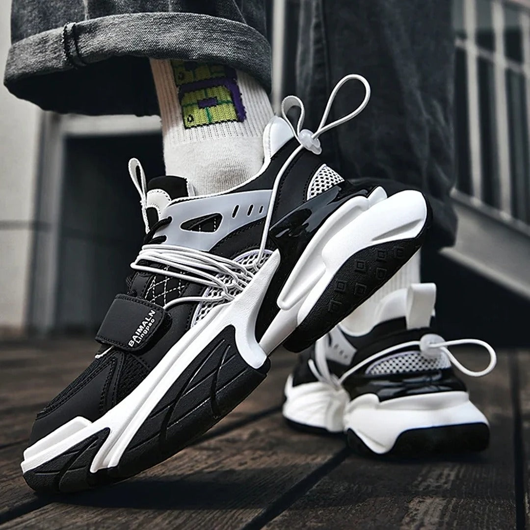 Sleek black and white styling with layered contrast makes these sneakers a visual statement in any fit.