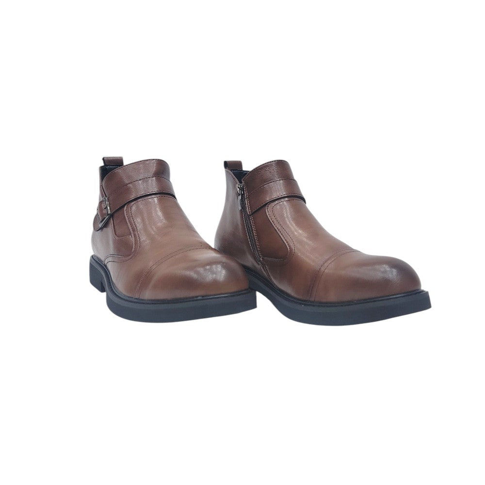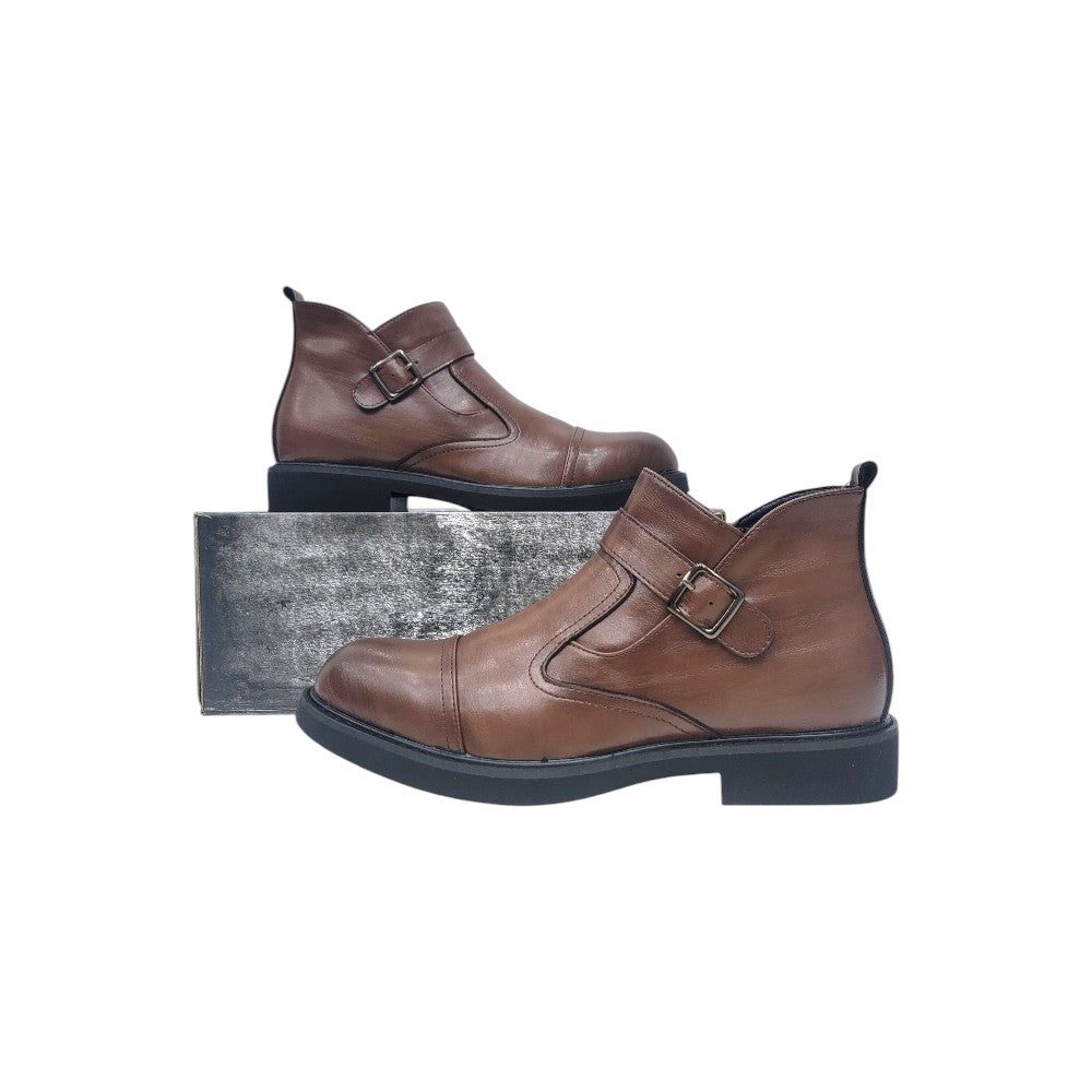 Upgrade your footwear collection with this brown ankle Chelsea boot featuring a unique monk strap buckle. Combining the easy slip-on convenience of Chelsea boots with the bold style of a monk strap, this boot offers versatility, sophistication, and comfort for any occasion.